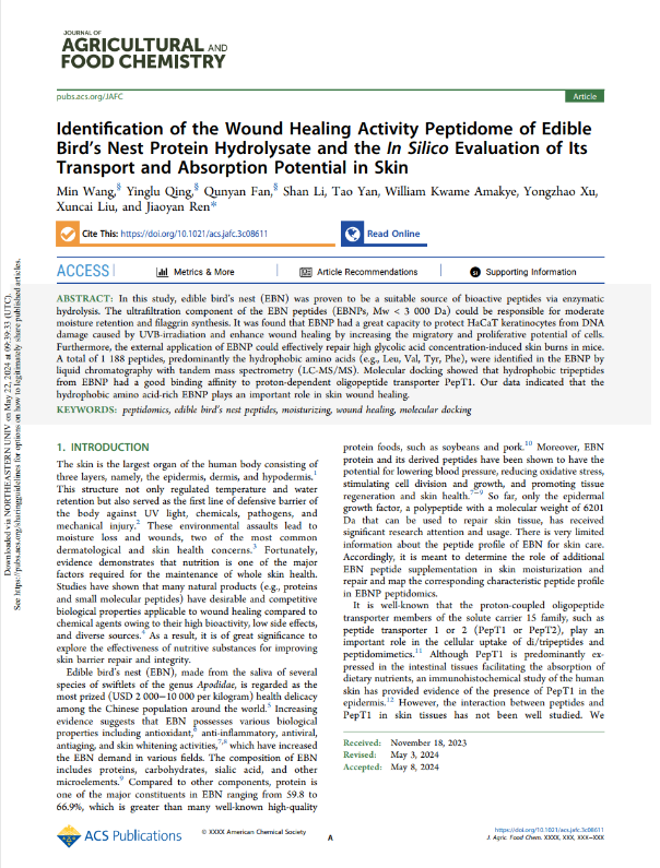 在持續(xù)的研究中,2024年燕之屋聯(lián)合華南理工大學(xué)發(fā)表燕窩肽科學(xué)論文“Identification of the Wound Healing Activity Peptidome of Edible Bird's Nest Protein Hydrolysate and the In Silico Evaluation of Its Transport and Absorption Potential in Skin”被食品科學(xué)領(lǐng)域國際權(quán)威SCI收錄期刊《Journal of Agricultural and Food Chemistry》正式收錄。該研究表明,“燕之屋燕窩肽可能作為一種潛在的修復(fù)成分,具有抵御外部有害因素的潛在能力,如太陽照射和有機(jī)酸。”