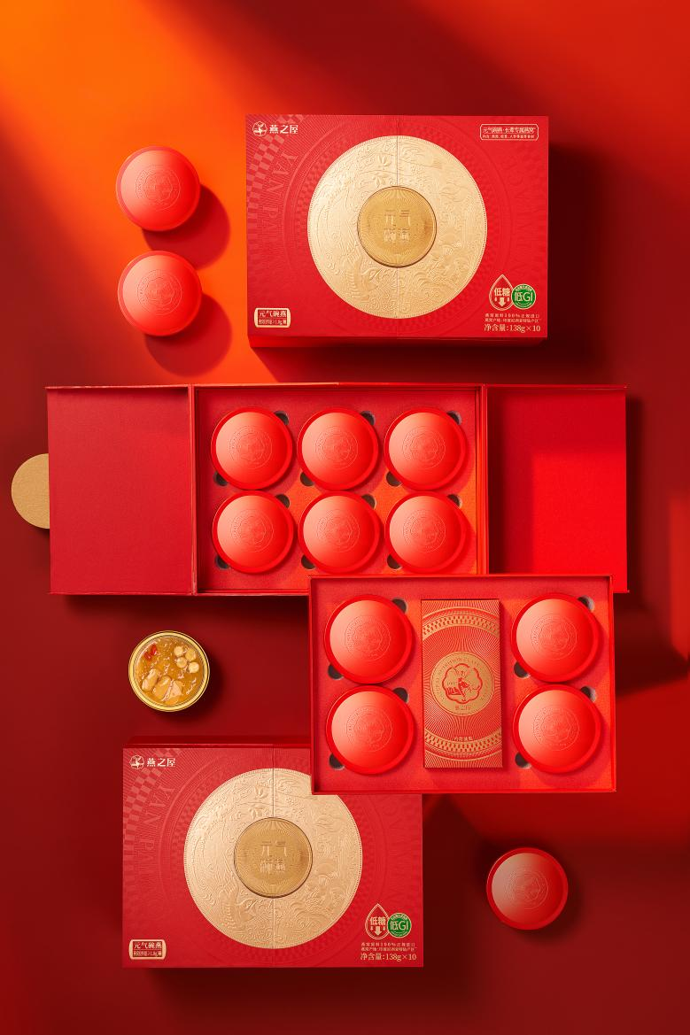 碗燕·元氣款采用中國紅與黃金色系的精美配搭,凸顯光亮色澤與尊貴質(zhì)感,大方得體,有禮有面,作為母親節(jié)禮物盡顯尊貴格調(diào)。禮盒設(shè)計圍繞“圓”的概念,以年輪為設(shè)計意象,象征歲月賦予的智慧,也傳遞著圓滿之意。盒上刻畫金燕反哺動人圖景,祥云繁花環(huán)繞其中,蘊藏濃厚情意。獨特的對稱開盒頗具巧思與創(chuàng)意,內(nèi)里雙層設(shè)計,共承十碗珍饈碗燕·元氣款,滿載濃濃營養(yǎng)與深切關(guān)懷,讓滋補觸手可及,關(guān)愛無處不在。