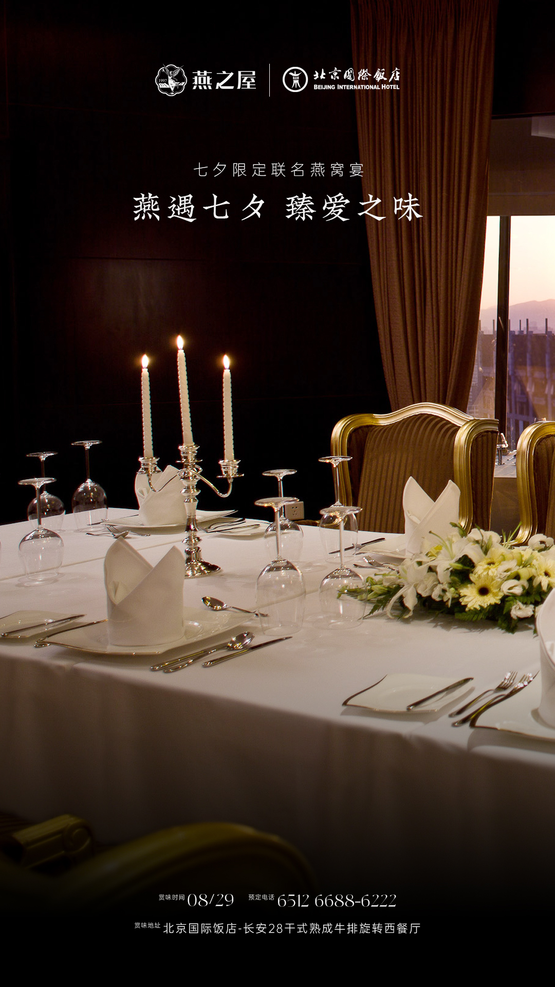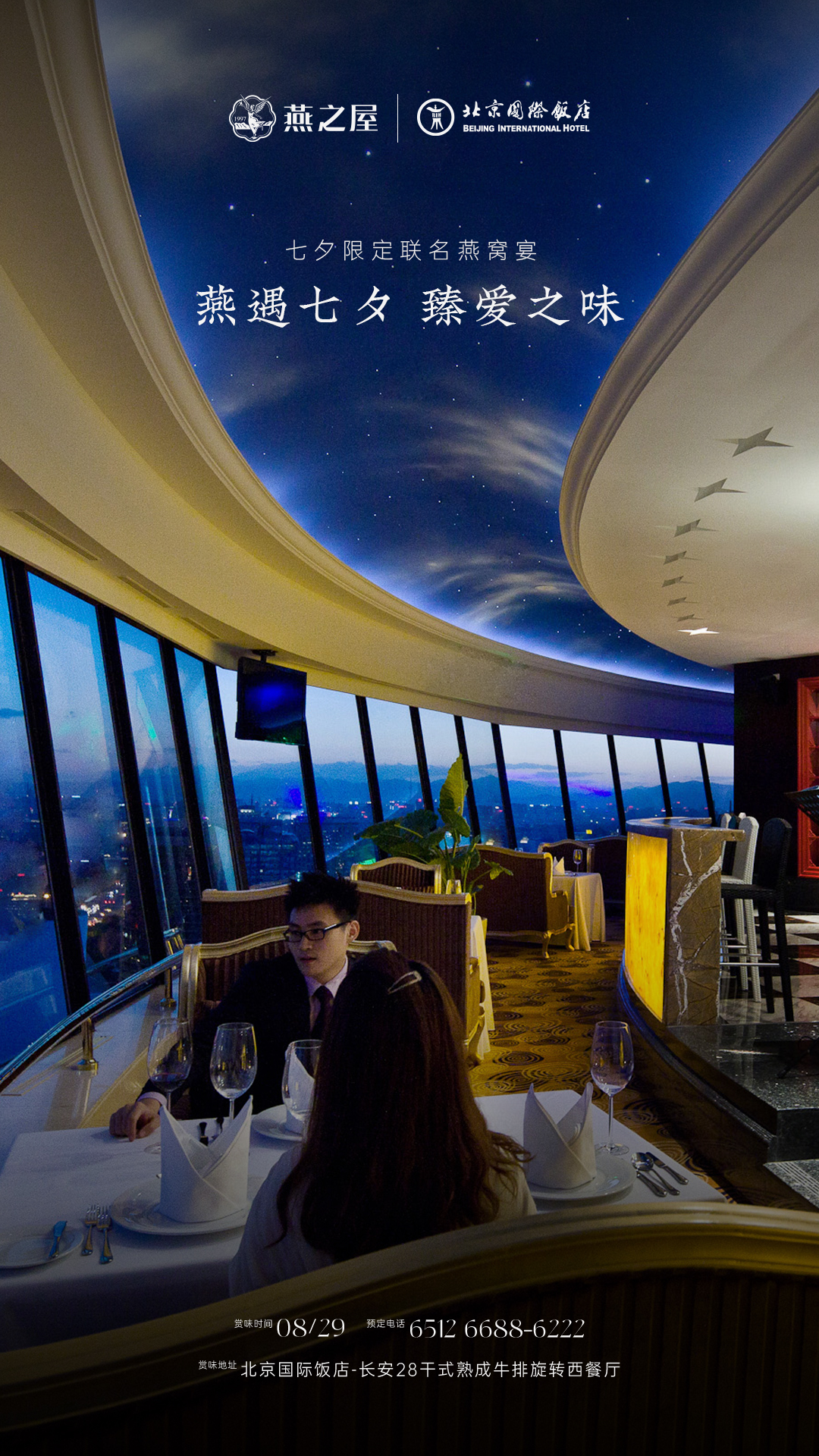 北京國際飯店長安28餐廳作為北京市中心高空360度環(huán)瞰京城盛景的旋轉(zhuǎn)餐廳,以其獨(dú)特的奢華與雅致并存的裝修風(fēng)格,成為京城高端餐飲場(chǎng)所。604㎡餐廳空間、100個(gè)精致餐位,3間多功能廳房,配合專業(yè)的服務(wù)團(tuán)隊(duì),為每位賓客提供尊貴的用餐體驗(yàn)。燕之屋27年專注高品質(zhì)燕窩,始終堅(jiān)持“源于天然,美與健康”的理念,以創(chuàng)新科研賦能上乘品質(zhì),連續(xù)九年高端燕窩全國銷售第一①。此次合作是云端視野與輕奢品味的雙重尊享,正如每一對(duì)相約七夕的甜蜜愛侶。
