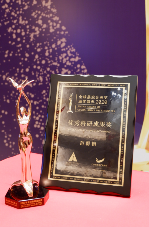 5月27日,燕之屋榮獲福建省食品工業(yè)協(xié)會頒發(fā)“科技成果轉(zhuǎn)化示范企業(yè)”獎項、燕之屋燕窩研究項目獲“第六屆福建省食品工業(yè)科學技術(shù)進步一等獎”,燕之屋副總經(jīng)理、研發(fā)總監(jiān)范群艷亦被頒予“福建食品工業(yè)40年突出貢獻人物”獎項。