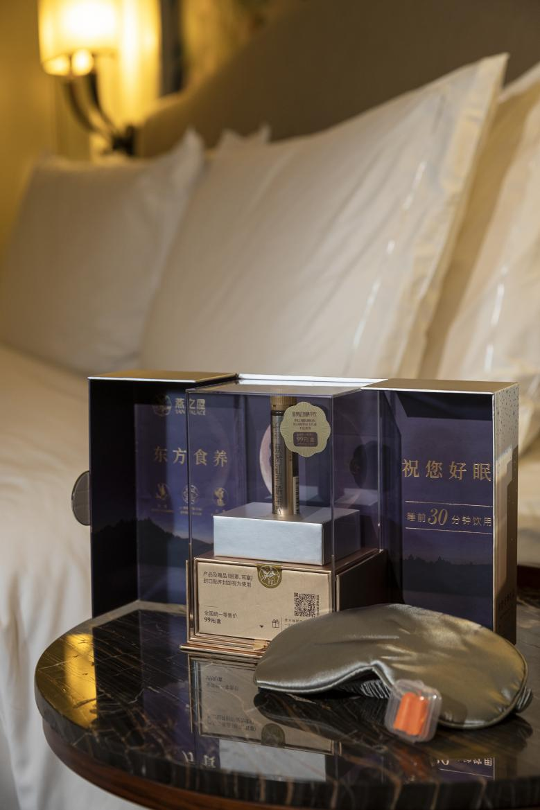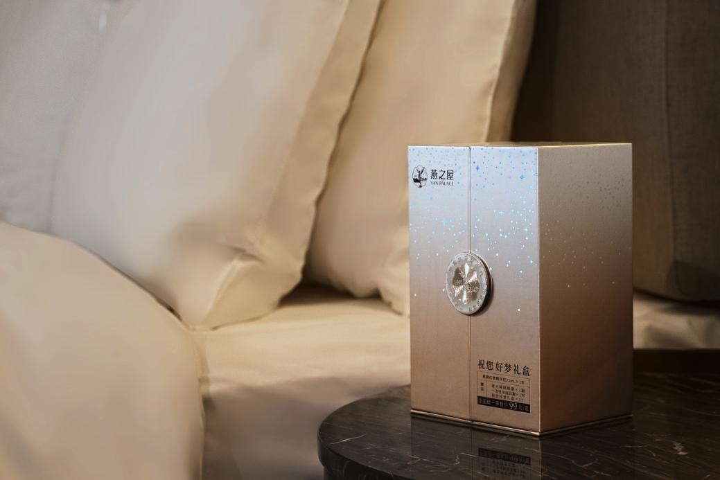 更加貼心的是,燕之屋·燕窩紅參精華飲(祝您好夢(mèng)禮盒)在包裝上亦煞費(fèi)苦心。燕之屋·燕窩紅參精華飲(祝您好夢(mèng)禮盒)外包裝以金屬光澤的漸變香檳金為基調(diào),以繁星、女神為元素,中心搭配燙金logo設(shè)計(jì),有一種渾然天成的靜謐;內(nèi)里則由深邃的星空、靜謐的湖水、溫柔月光下的女神融合而成,水天一色的景象恍若夢(mèng)境。打開(kāi)禮盒,燕之屋·燕窩紅參精華飲、遮光眼罩、輕巧耳塞躍然而出,仿佛在敦促投宿者漸入夢(mèng)境。旅途奔波后下榻海悅山莊,臨睡之際,不妨放緩步調(diào),飲一支燕窩紅參精華飲,戴上眼罩和耳塞,用一盒安睡組合,沉淀身心,安享五星級(jí)睡眠之旅。